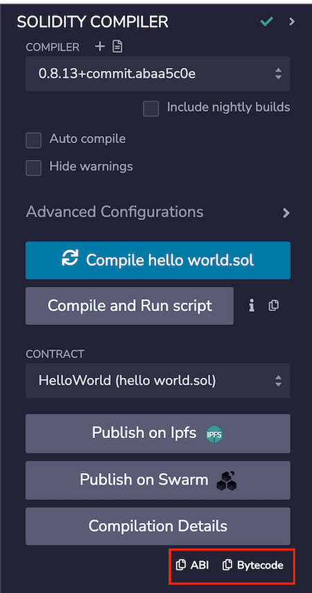 The contract ABI and Bytecode are available on the Solidity compiler tab.