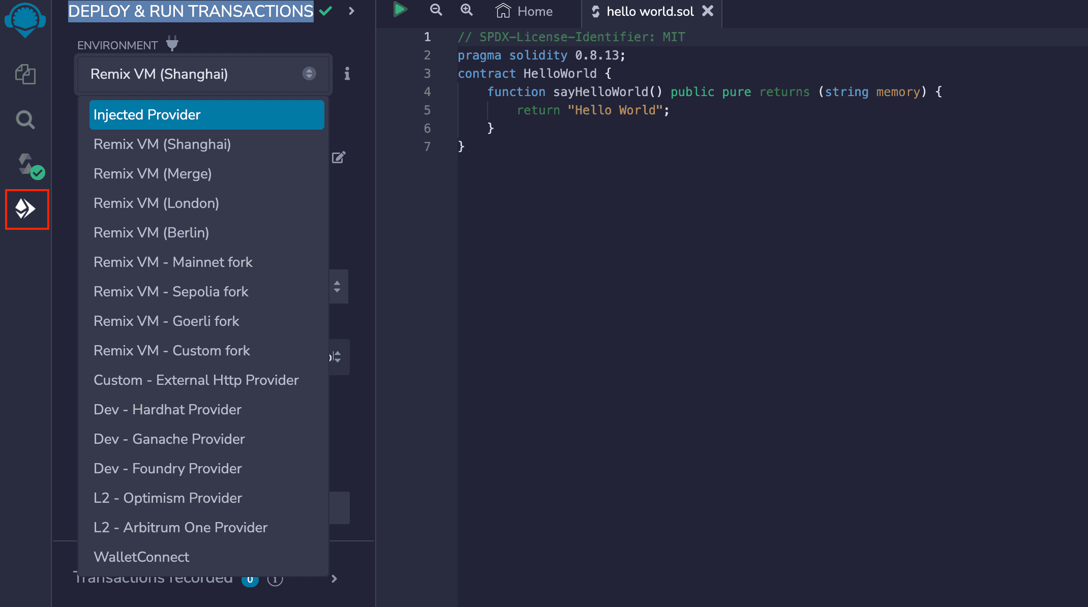 Now, the smart contract is compiled, Core is injected, and we are ready to deploy our Hello world contract. Click "Deploy."